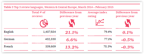 Dopo l’inglese, come lingua madre delle recensioni c’è il francese (13,2% delle recensioni in Europa), seguito a distanza dal tedesco (6,6%).