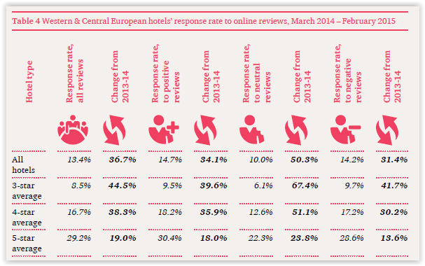 Vediamo prima i risultati principali dell’analisi, condotta su 11mila recensioni in 48 città del mondo. Gli alberghi a 5 stelle sono quelli con le recensioni migliori e con il più alto tasso di risposte alla recensioni, sia quelle positive sia quelle negative. Per inciso, troppo pochi hotel rispondono: in media, globalmente, il 13,4%.